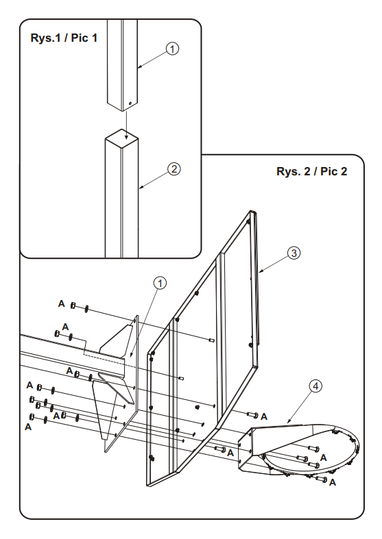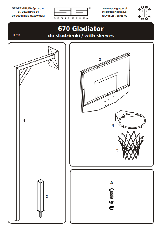 The set consists of a square profile post (100 x 100 mm), a trapezoidal steel backboard (120 x 90 cm, 4 cm thick) and an extremely durable basket (model 264.4) made of 18 mm diameter steel pipes, reinforced with a collar and fully galvanized.