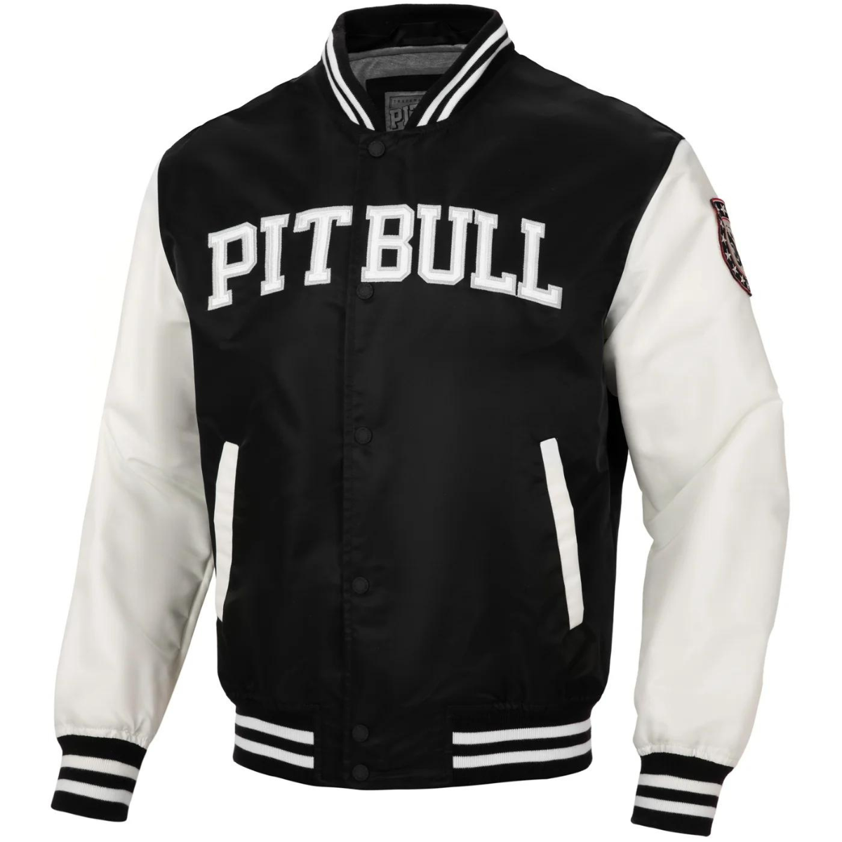 Duży wyszyty napis Pit Bull na klatce piersiowej, dodający charakteru i stylu.